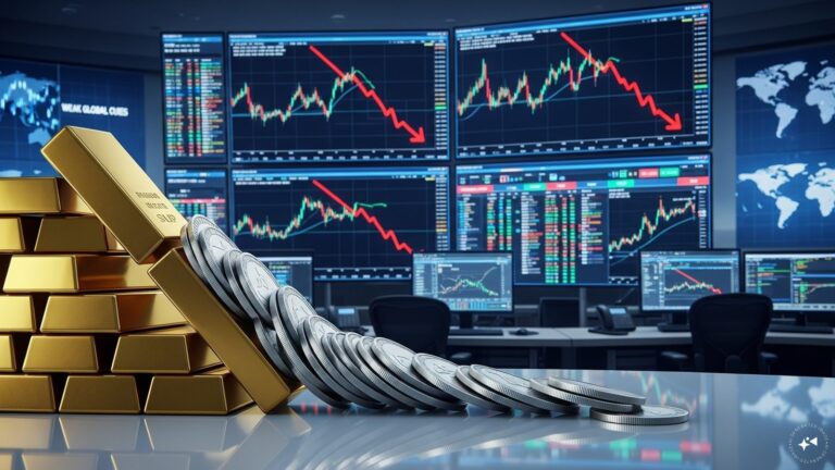 Gold and silver futures fell in India as global prices weakened, gold dipped slightly while silver dropped more on profit booking, pressured by a strong dollar and cautious sentiment.